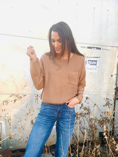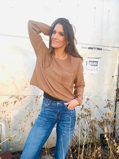 Cozy up in this charming crewneck sweater featuring a cropped silhouette, long sleeves, and a handy front pocket for all your essentials. Perfect f...