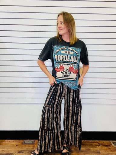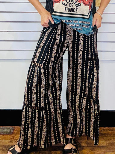 The Sofia Tier Leg Pants feature wide, tiered flare legs with a delicate lace insert. They come in a fun black print and offer an easy pull-on styl...
