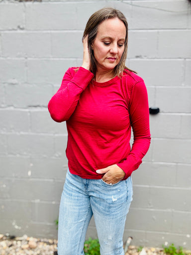 This elegant long-sleeve top features a refined crew neckline and is ideal for layering. Made from a luxurious blend of cool silk cotton and spande...