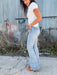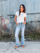 The Farrah Flare in Spring Snowflakes offers a delicate take on Driftwood’s signature flare silhouette. Designed in a soft light wash denim, this elegant style features tonal white embroidery inspired by intricate snowflake and floral motifs, beautifully placed along the leg and hem. The subtle embroidery blends seamlessly with the denim for a refined, textural look while maintaining a fresh, modern feel. A flattering high-rise waist and classic flared leg create an elongated silhouette, making the Farrah Flare an effortless statement piece with understated artistry.