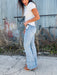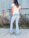 • Details: Light wash denim, tonal white snowflake-inspired embroidery along the leg and hem, flared silhouette, classic five-pocket styling, zip fly with button closure