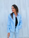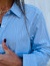 The Dylan Hi-Lo Modern Top brings effortless sophistication to your everyday wardrobe. This classic button-up features a crisp blue and white pinstripe pattern with a timeless collared neckline and long sleeves for versatile styling. The hi-lo hemline adds contemporary flair, making it perfect for tucking in or wearing loose. Dress it up with tailored trousers or down with your favorite jeans—this piece transitions seamlessly from office to weekend.