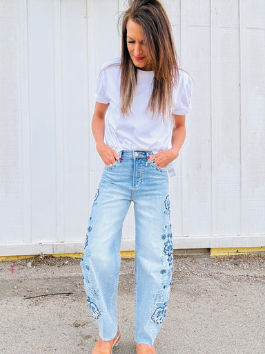 The Parker Wide Leg Barrel in Aqualina offers a modern silhouette with beautifully detailed embroidery. Crafted in a soft medium wash denim, this s...