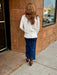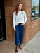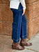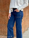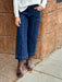 This super high-rise wide-leg crop features a tailored trouser-style hem with a seam down the center of each leg. It includes darts above the back pockets and two front buttons with a wood-like finish, all highlighted by brown stitching on French Navy denim.