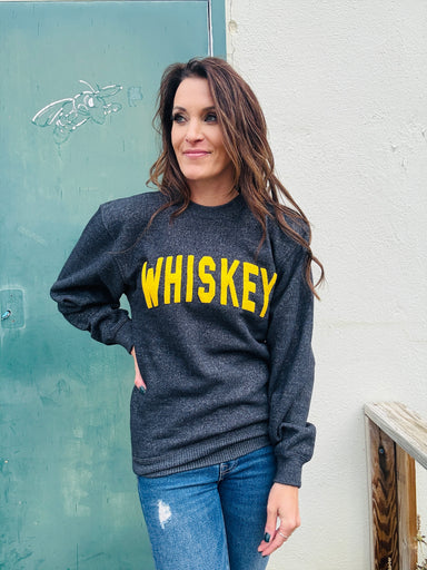 Cozy up in the kind of bold that speaks for itself — the Whiskey Knit Sweatshirt brings the heat with golden puff ink on a deep black textured knit...