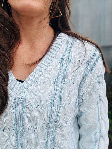 This cable knit sweater features a V-neckline, long sleeves with ribbed cuffs, and a chunky textured pattern throughout, finished with a ribbed he...