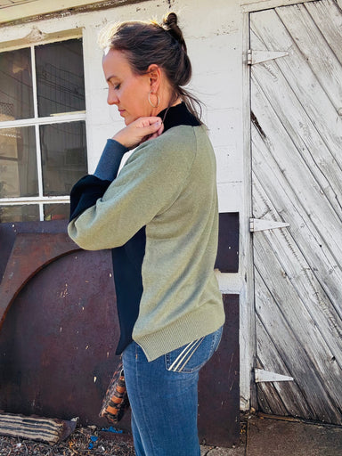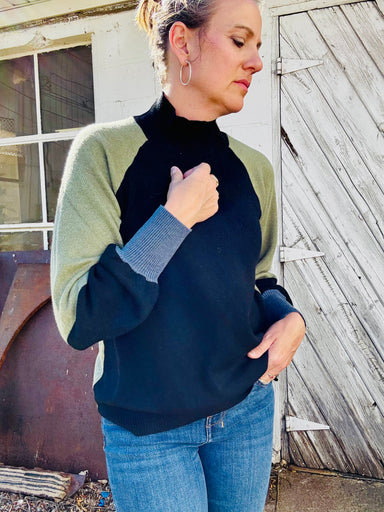 Get playful with this color blocked mock neck sweater, featuring fun bubble sleeves and cozy ribbed details on the hem, neck, and cuffs. Side slits...
