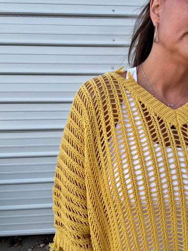 Meet the Traci Sweater: cozy long sleeves, airy open knit, relaxed fit, a cheeky V-neck, and trendy distressed edges. This mustard yellow gem is yo...
