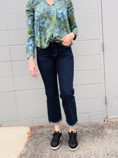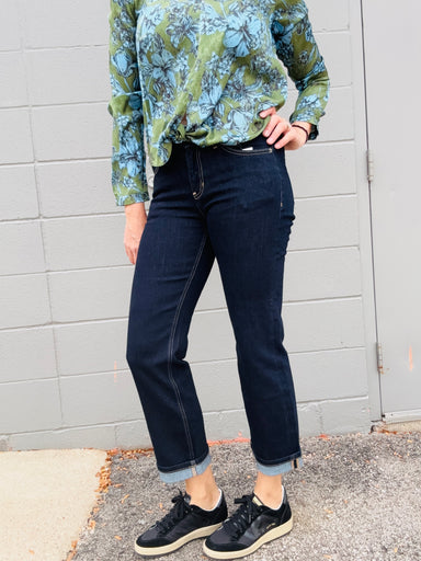 Elevate your wardrobe with the MICA Mid Rise ankle-length jeans in a deep blue cuffed finish. Featuring a straight leg cut, this classic dress jean...