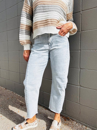 MICA Super High Rise Barrel Leg Jeans in Jeans Aid Blue feature a stylish barrel silhouette with unique seam accents. Made in light wash denim, the...