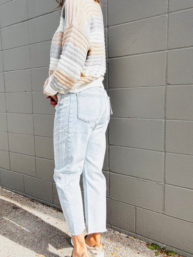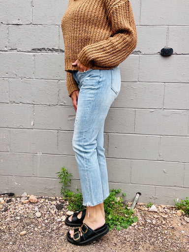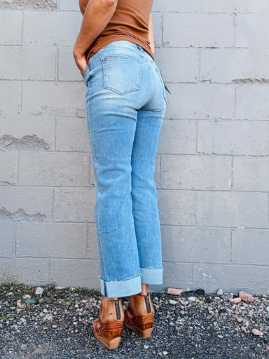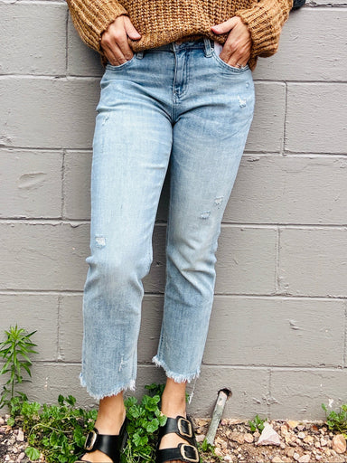 This MICA Denim features a high-rise fit with a straight leg that flatters your tummy, plus a fun frayed cuff and a stylish faded front for extra f...