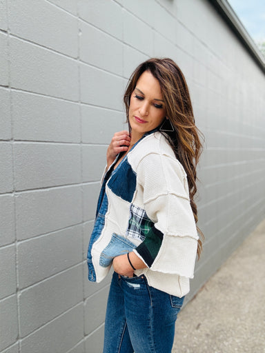 Layer on effortless style with this charming patchwork button-down jacket. Featuring a mix of textured fabrics and delicate floral prints in soothi...