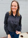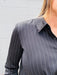 This loose-fitting, collared shirt features long sleeves, a button-down front, and a stylish stripe pattern with a twisted bottom detail. Its hi-lo hem adds a modern touch, making it a versatile wardrobe essential for effortless style.