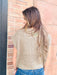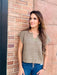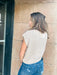 Solid cap sleeve notched neck knit sweater with small patch detail on the front.