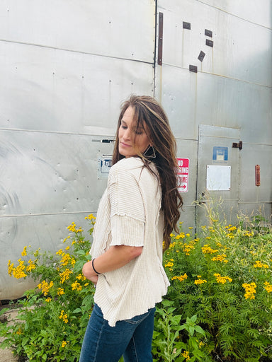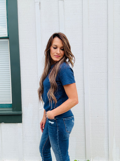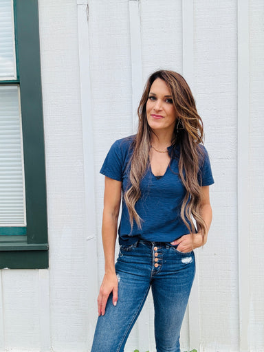 Looking perfect in Plata. Our Plata Notched Tee is your new casual weekend style BFF. It features a notch neckline, raw edges, and a relaxed fit f...