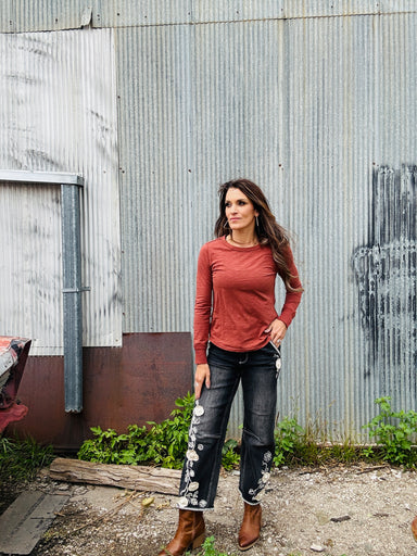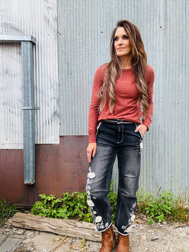 Barbara x Ravishing Rosettes jean by Driftwood. Wide-leg jeans adorned with elegant embroidery and floral applique details. Fabric: 93% Cotton 5% ...