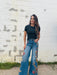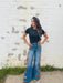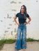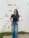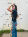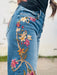 Penelope by Driftwood. Medium wash with Pressed Flower embroidery, adding a touch of artistry to elevate your wardrobe. The design cascades from the pocket down the leg, with a small floral accent on the back pocket.