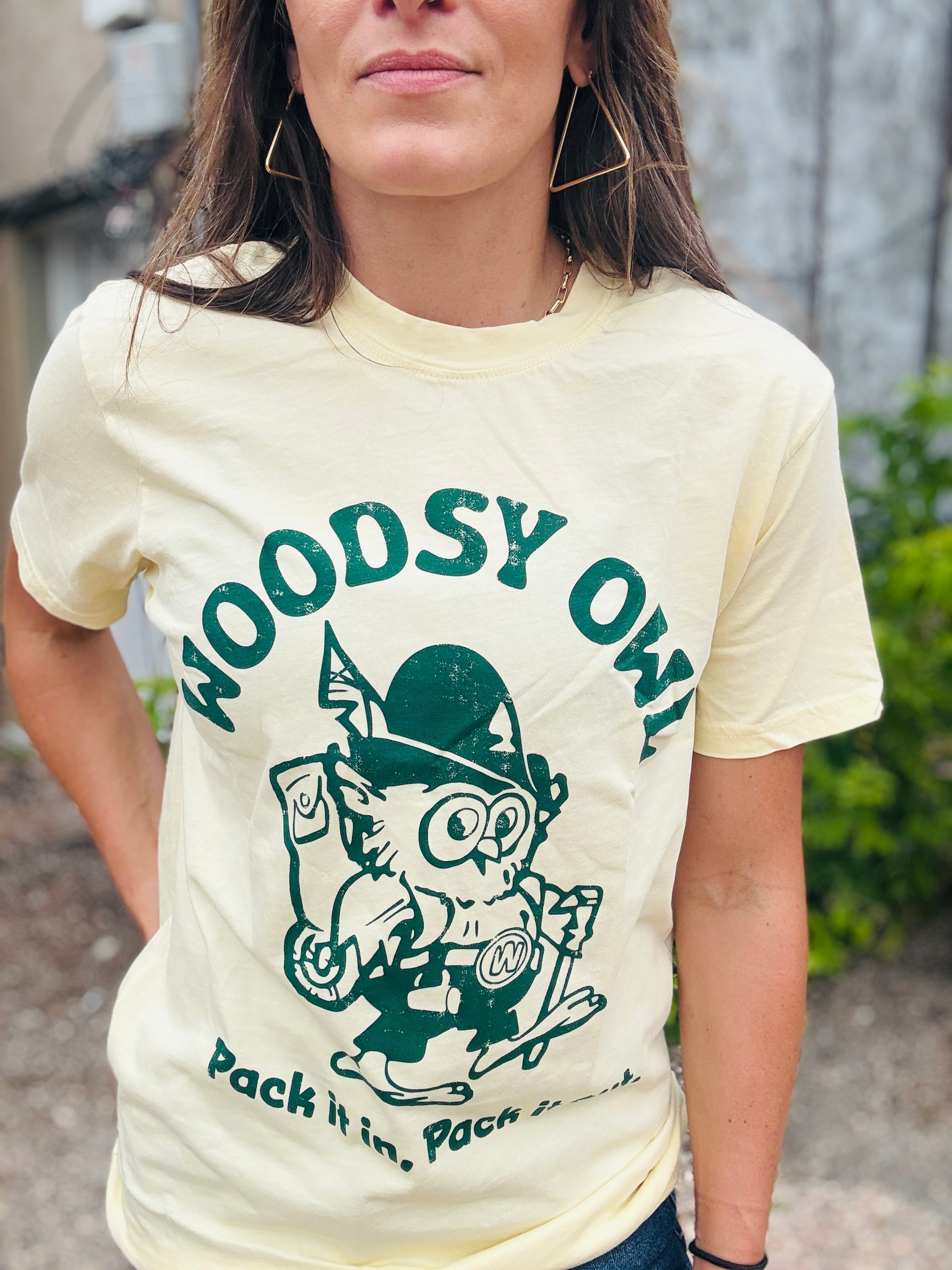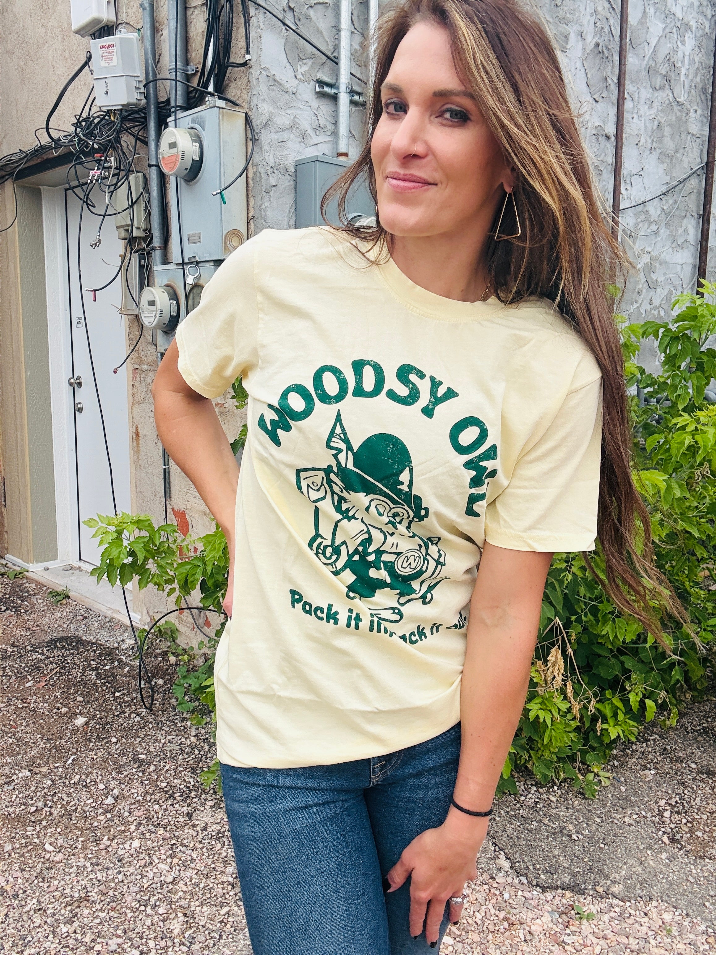 This American Needle tee is made from 100% cotton with a vintage heavy wash for a worn-in feel. It features a trim athletic fit and a ribbed crew neck collar. The front sports a distressed screen-printed logo of a Woodsy Owl with the playful "Pack it In Pack it Out" message.