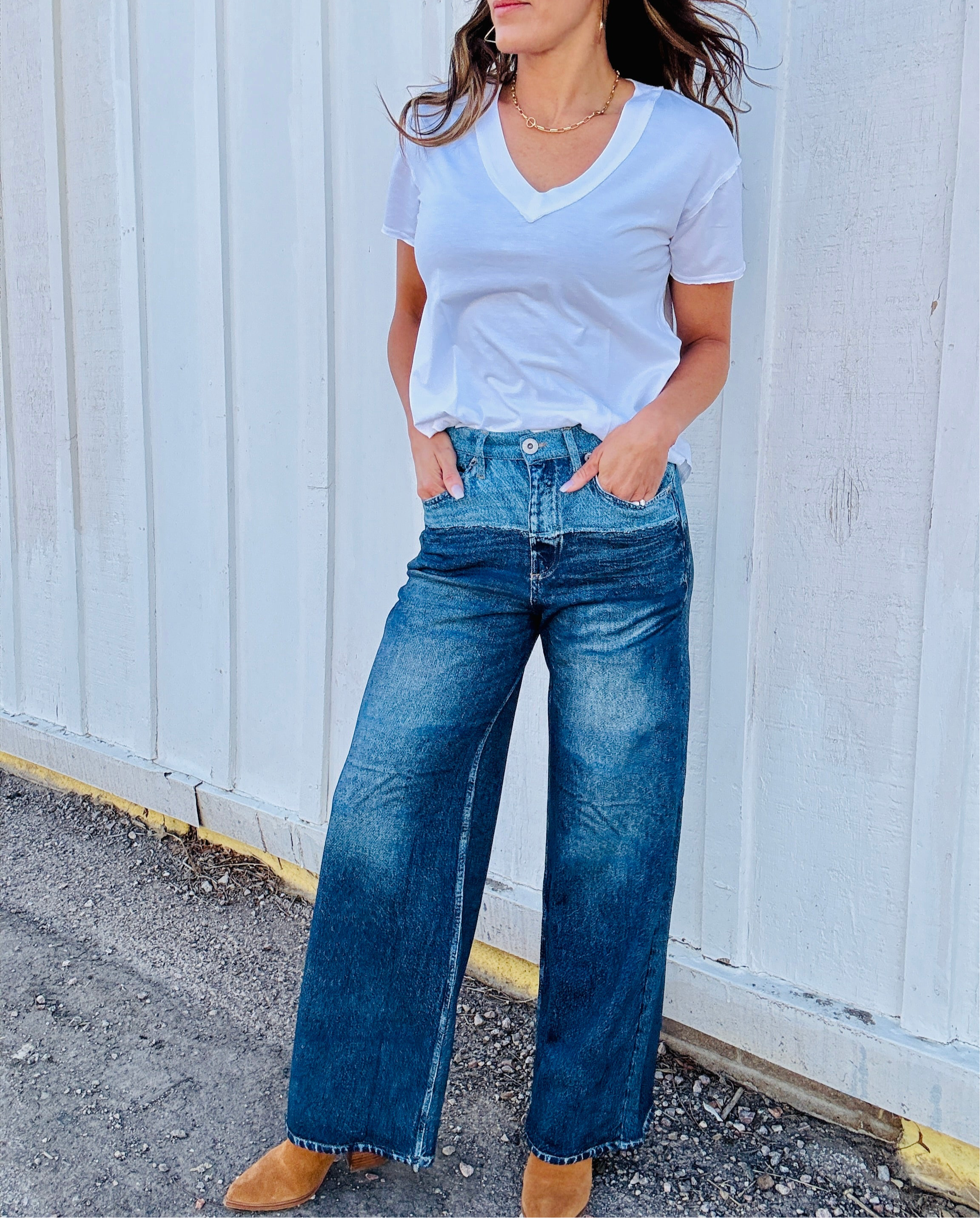 The Jade Jeans offer a relaxed straight-leg fit with a unique two-tone design. This stylish twist adds a distinctive touch to your staple denim, making them the perfect blend of classic and cool.
