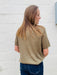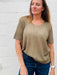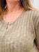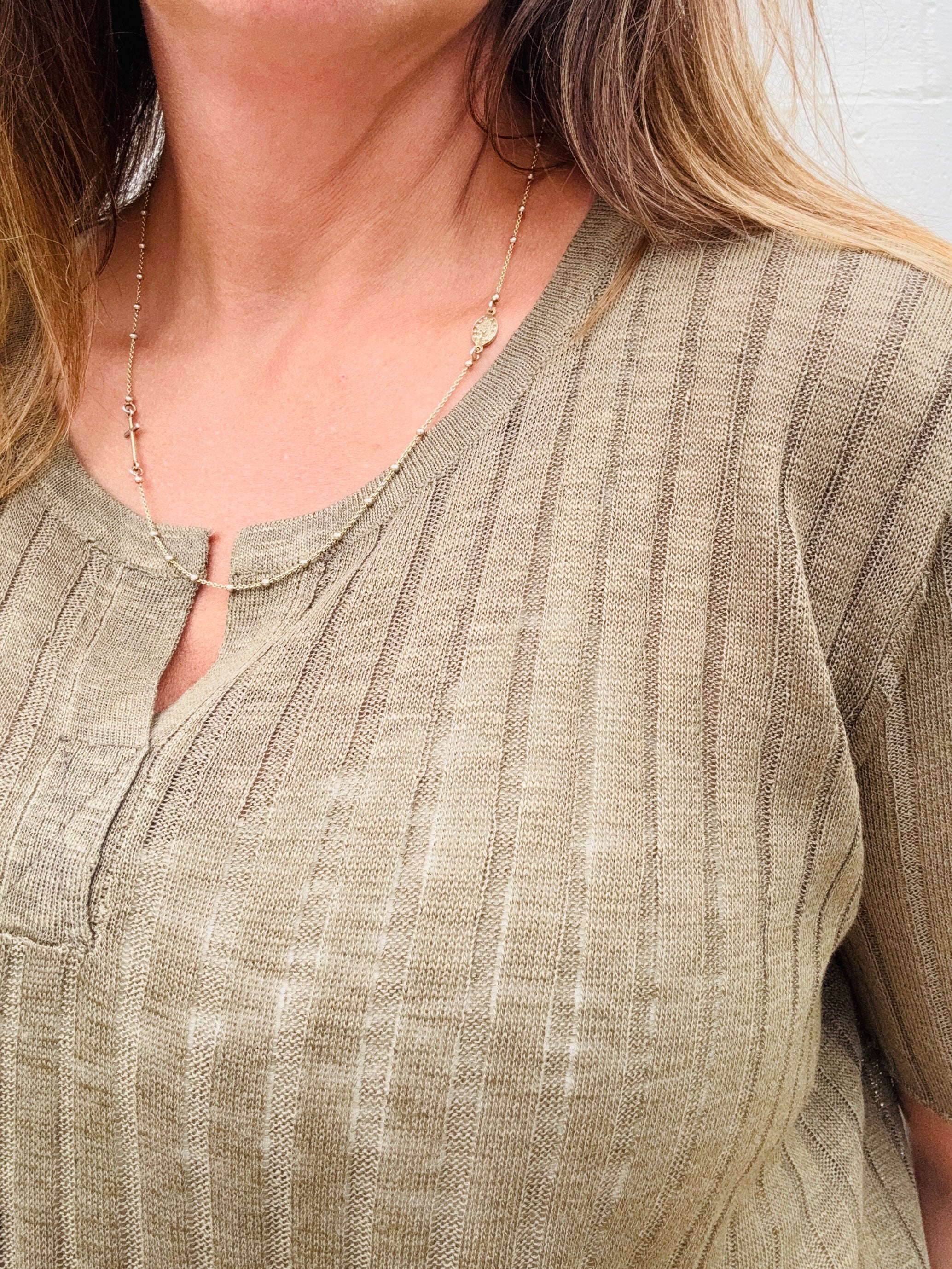 This textured knit top features a stylish notched v-neck and short sleeves, combining comfort with a chic look perfect for any occasion.
